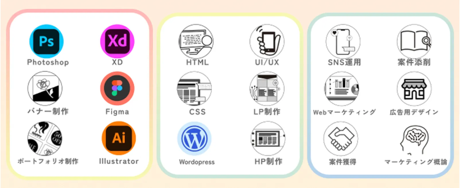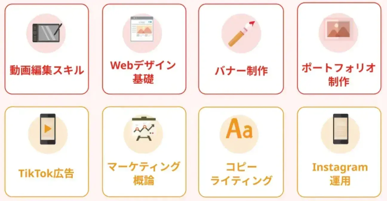 自分に適したものを選べるように、幅広いスキルを学べるスクールを選ぶのがおすすめです。またWEBスキルだけでなく、仕事獲得に必要なビジネススキルや、最新の生成AIスキルまで学べると、今の時代に求められるWEB人材として活躍につながりやすくなります。